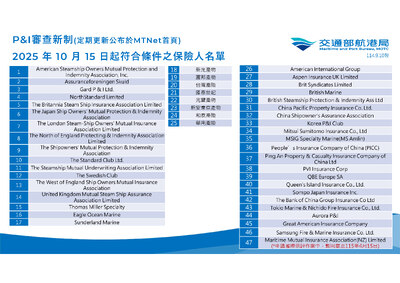 交通部航港局宣布,自114年10月15日起將正式實施「進港船舶船東責任保險(P&I)審查新制」,凡申請進出我國商港之船舶,須向 國際船東互保協會(IG P&I Club)、我國保險公司,或是國際信評機構(標準普爾、穆迪、惠譽、貝氏)評等達 BBB以上 的保險人投保。目前符合新制規範的船舶已達 96.7%,航港局並強烈呼籲尚未符合規定的船東,應儘速完成合規投保,以免屆時受限無法進港。