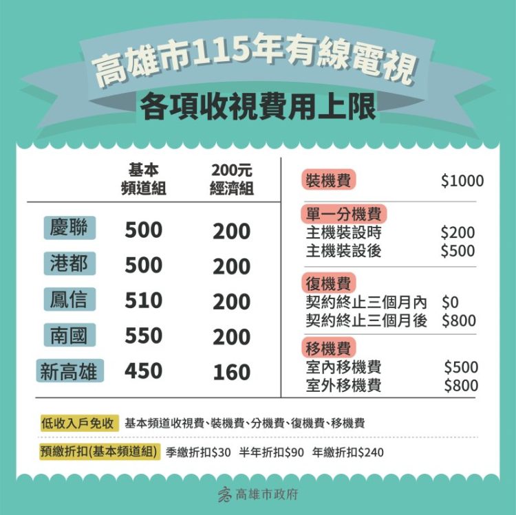 為持續穩定民生物價、減輕市民家庭支出負擔,高雄市政府 日前正式公告 115 年度有線廣播電視各項收費上限,高雄市轄內 5 家有線廣播電視系統經營者 之收視費用 全面不予調漲,各項費率均維持與 114 年 相同水準。