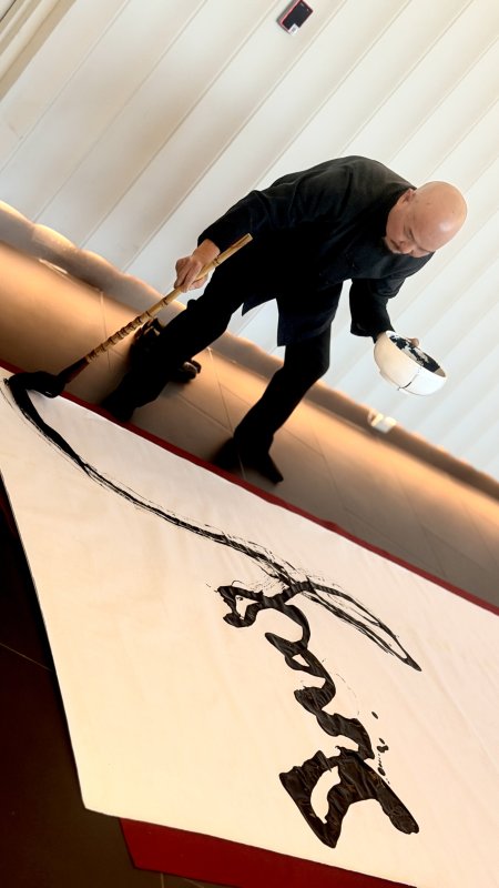 揭幕儀式現場,在悠揚古箏樂聲襯托下,許文融大師同步為雕塑作品《美麗傳說》之名現場揮毫,以大毛筆揮灑磅礡氣勢,筆墨線條剛柔並濟,展現深厚書法底蘊。「美麗傳說」四字墨寶與雕塑作品相互呼應,使現場藝術氛圍層次更顯豐富,也讓與會來賓留下深刻印象。