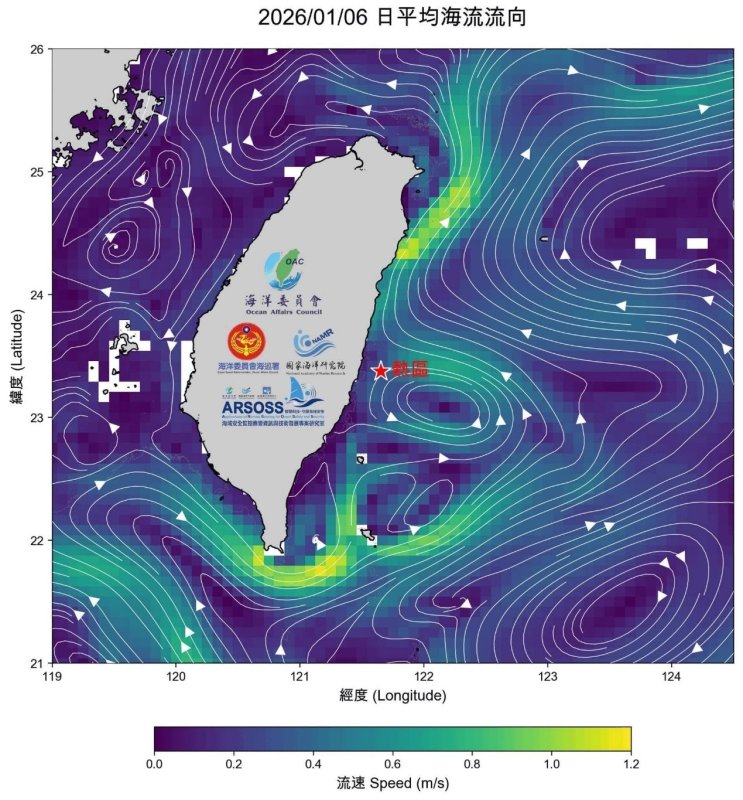 第二項證據則來自國海院運用 1 月 6 日至 1 月 14 日的歐盟哥白尼海洋服務資料,製作的海面背景海流動畫。該資料為模式與觀測同化後的大尺度背景流場,特別有助於理解黑潮主流軸線位置與周邊渦旋結構的整體變化。不過,國海院也提醒,此類背景流場並未納入潮汐與局部風浪造成的瞬時變動,因此在近岸區域,仍須搭配漂流浮標或海洋雷達等現地觀測資料,才能掌握更細緻的海流狀況。