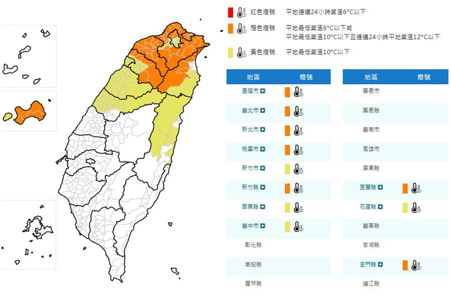 今天2月7日寒流南下,中部以北、東北部及東部天氣明顯轉冷,其他地區早晚亦冷,8日至9日清晨再受寒流影響,各地天氣非常寒冷。氣象署清晨發出低溫特報:新北、基隆、臺北、桃園、新竹縣、宜蘭、金門等縣市非常寒冷,有持續出現10度左右或以下低溫的機率;新竹市、苗栗、臺中、花蓮等縣市,亦有10度以下低溫發生的機率。請注意保暖,農作物及水產養殖業慎防寒害。