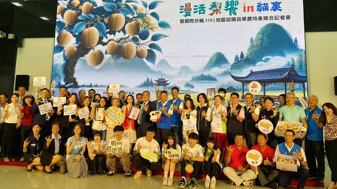苗栗縣政府昨(9)日邀集頭份市廣興社區與卓蘭鎮雙連社區、坪林社區、景山社區、食水坑社區、東盛社區舉辦「漫活梨饗in貓裏」宣傳會;國際扶輪社3501地區總監劉正輝也率第二及第三分區8個扶輪社社長到場支持,並在現場認購了40萬元的水梨,捐贈給縣內幼安教養院等5個社福單位,不僅協助果農,更將愛心回饋給弱勢團體,讓社會充滿溫暖。
